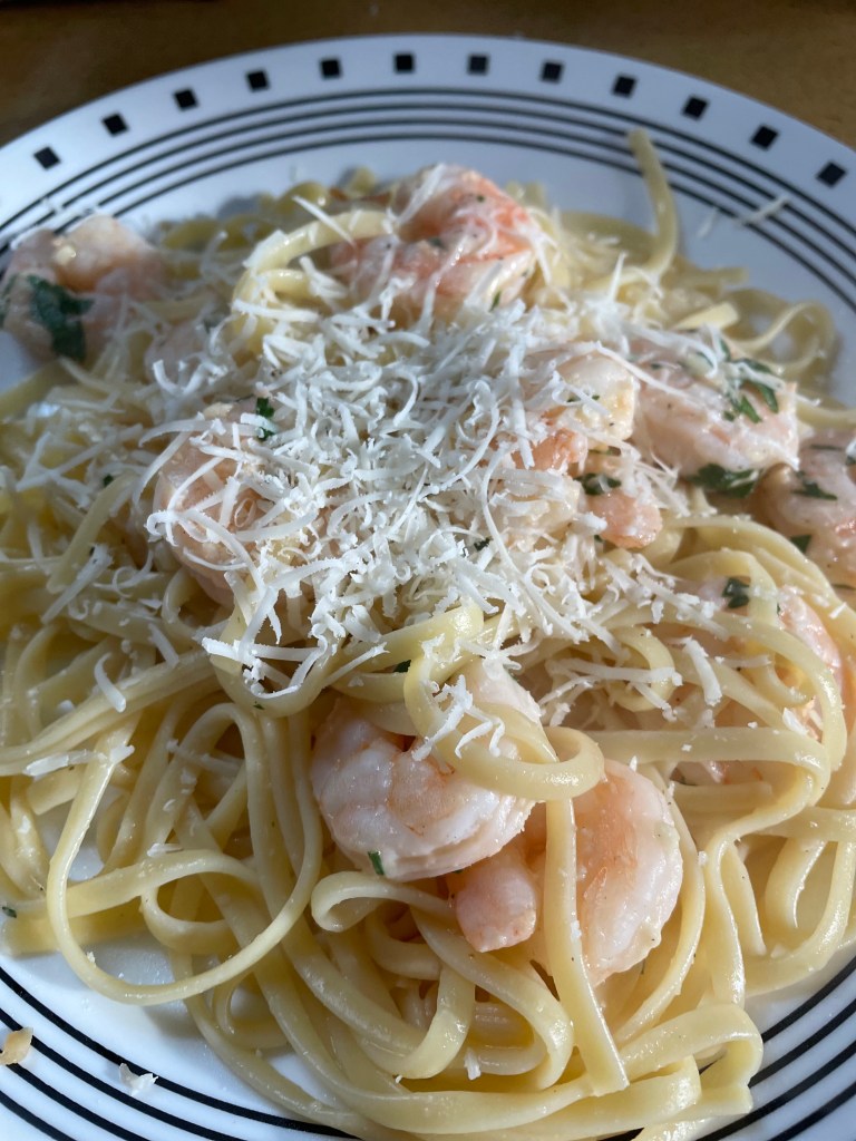 First time attempt at shrimp scampi. Just for Noah and I. Based on how clean his plate was, I can safely say he enjpyed it. Although I periodically look out in the dog run to see if he dumped his plate out his window, not that he has done that. Now his older brother Brandon stuffed food in his sock once and tossed it out his window… this was years ago, I was still learning!