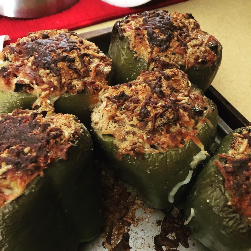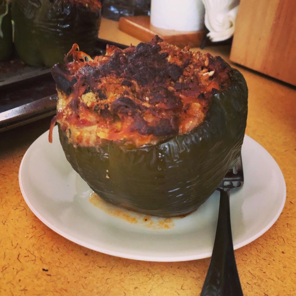 These are surprisingly easy to make. Don’t bother if your kids refuse to eat a bell pepper. The stuffing can really be anything, especially because the kids wouldn’t eat it! I personally liked them. Quinoa, a ltlle bit of panko, various veggies and cheese. I had everything cooked for the most part before stuffing, so it was just waiting for the pepper to cook and a quick break under the broiler.